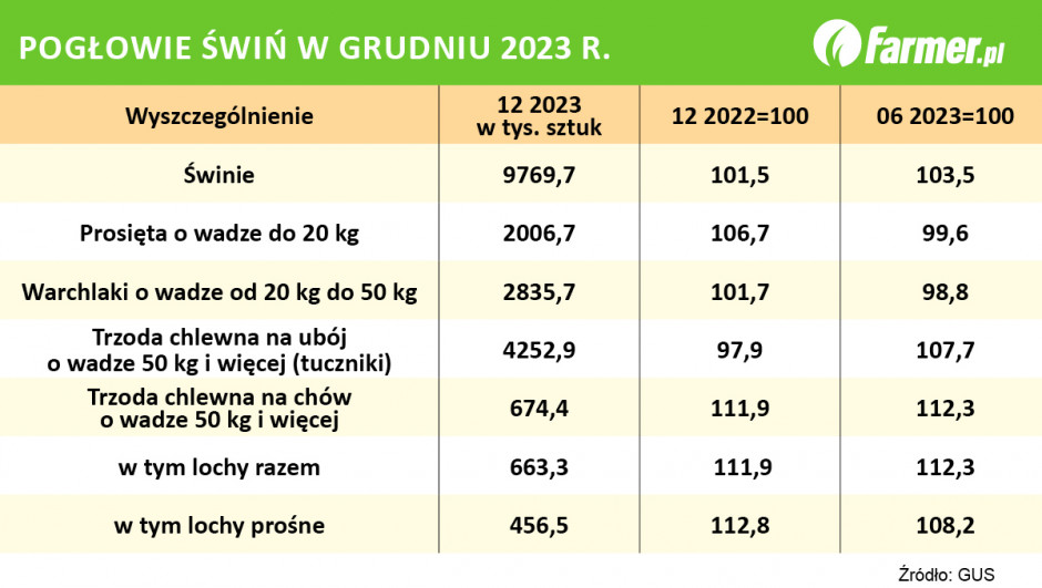 The general data on the pig population seem to be optimistic. Well, according to research by the Central Statistical Office, as of December 1, 2023, there were 9,769,700 pigs kept in our country. Compared to the beginning of June last year, the total pig population increased by 333.3 thousand. pieces, which gives an increase of 3.5%. Comparing current data with December 2022, we see that the pig population has increased by 1.5% over the year.
