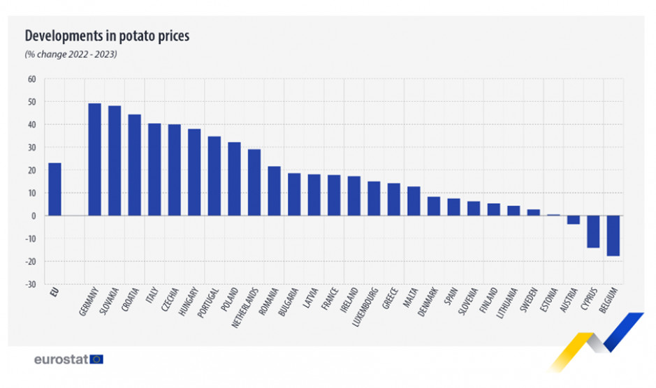 According to the EU statistical office, potatoes (including seed potatoes), after olive oil, increased in price the most in the EU in 2023 when it comes to the surveyed agricultural goods: by a total of 23%.